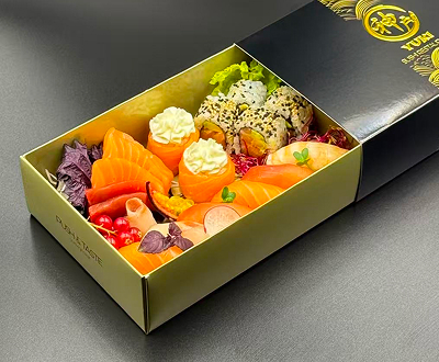 6 nigiri 8 uramaki speciali 6 hosomaki 2 gunkan 6 sashimi (Tutto a base di salmone)
